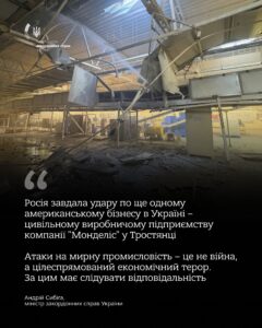 Глава МЗС України Андрій Сибіга: “Росія завдала удару по ще одному американському бізнесу в Україні – цивільному виробничому підприємству компанії “Монделіс” у Тростянці – одній з перших великих інвестицій США в незалежну економіку України.Ракета влучила в один з виробничих корпусів. На щастя, обійшлося без жертв.Це не військова ціль, а завод,